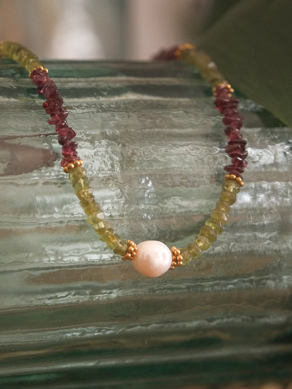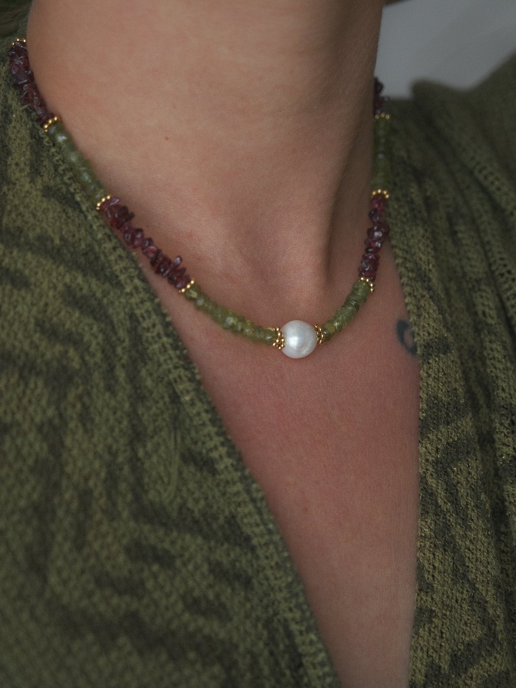 Ce collier associe la chaleur intense de la rhodolite aux tons framboise profonds, à la fraîcheur éclatante du péridot.