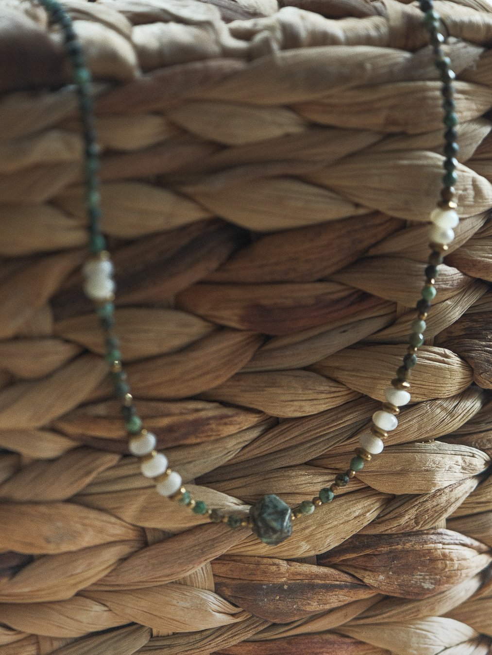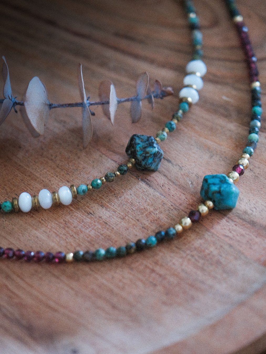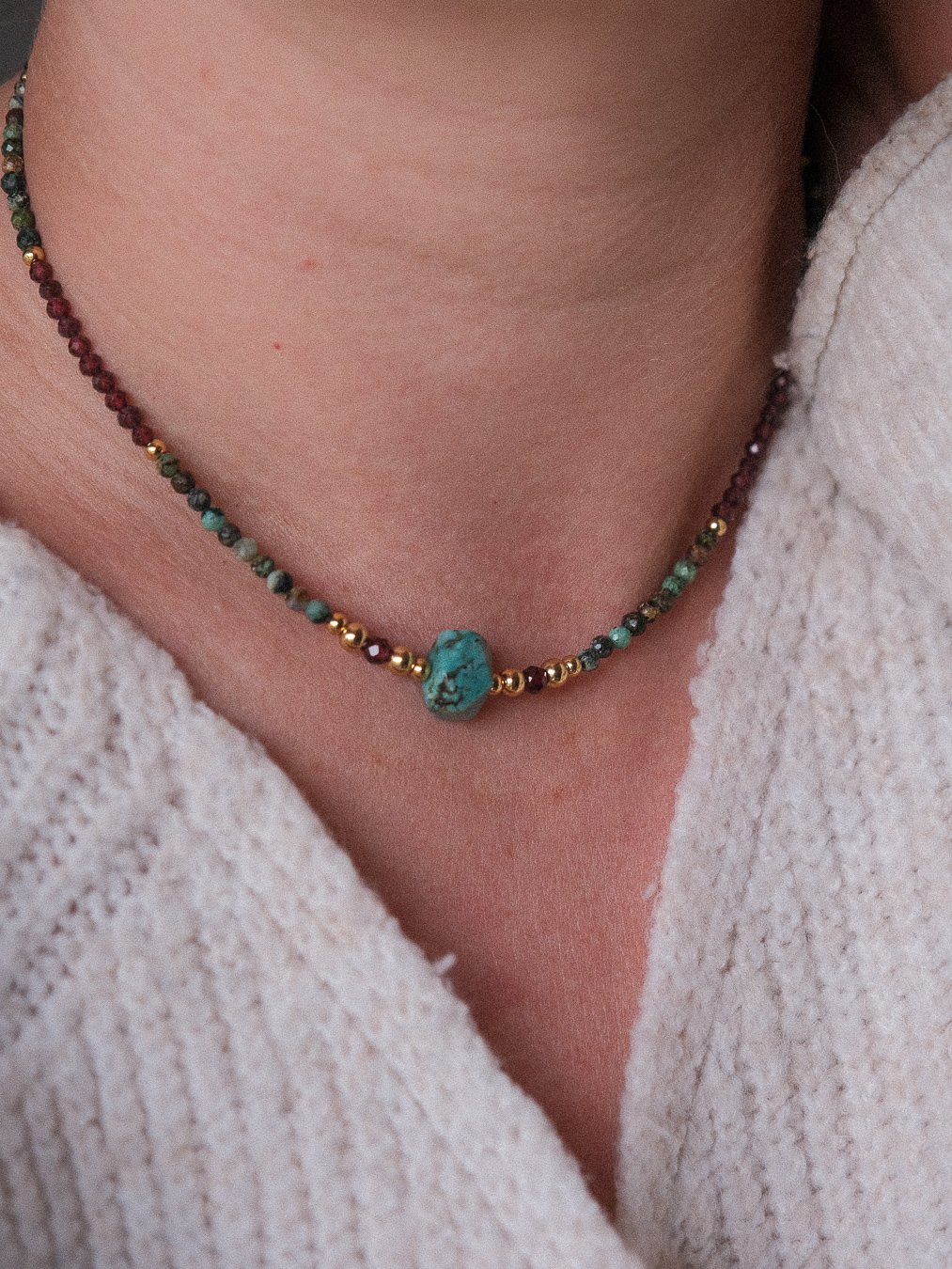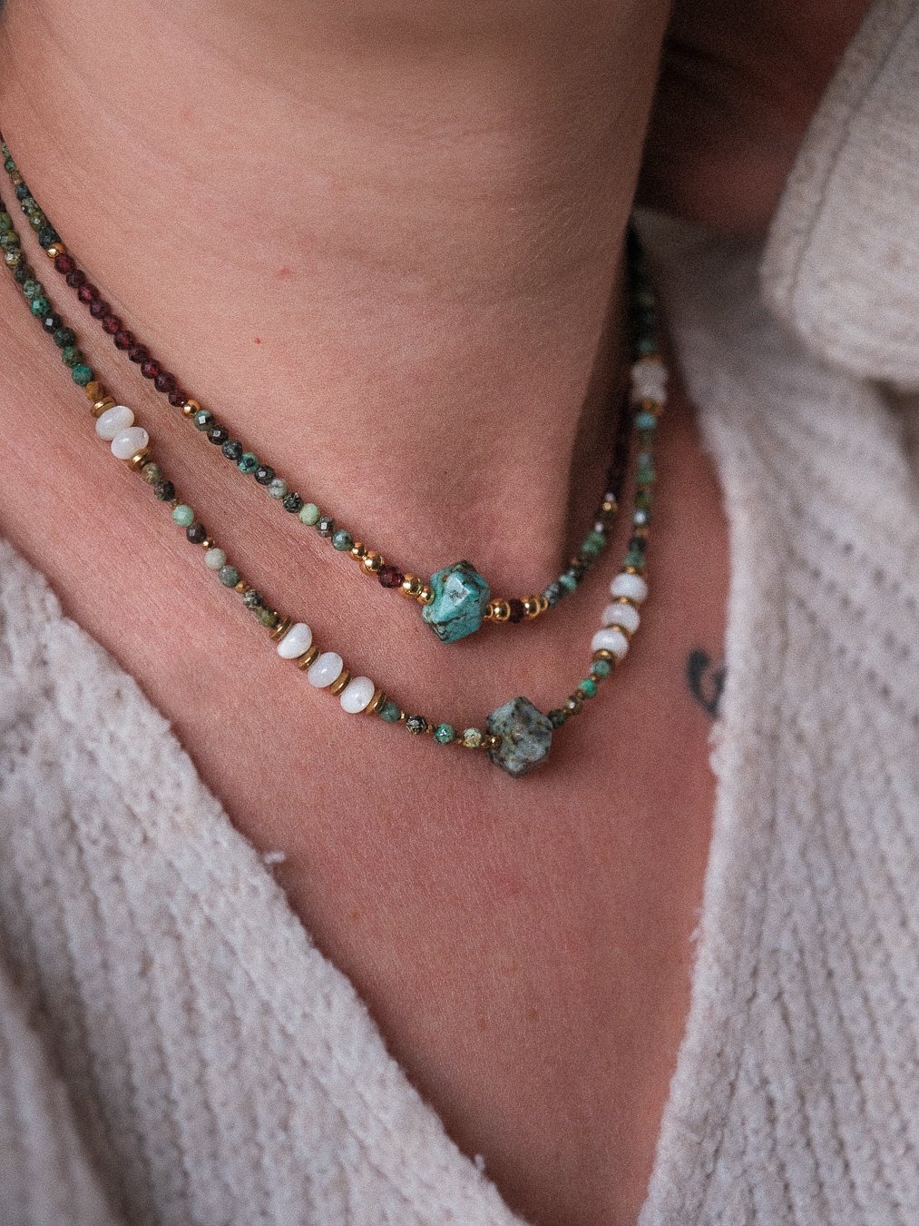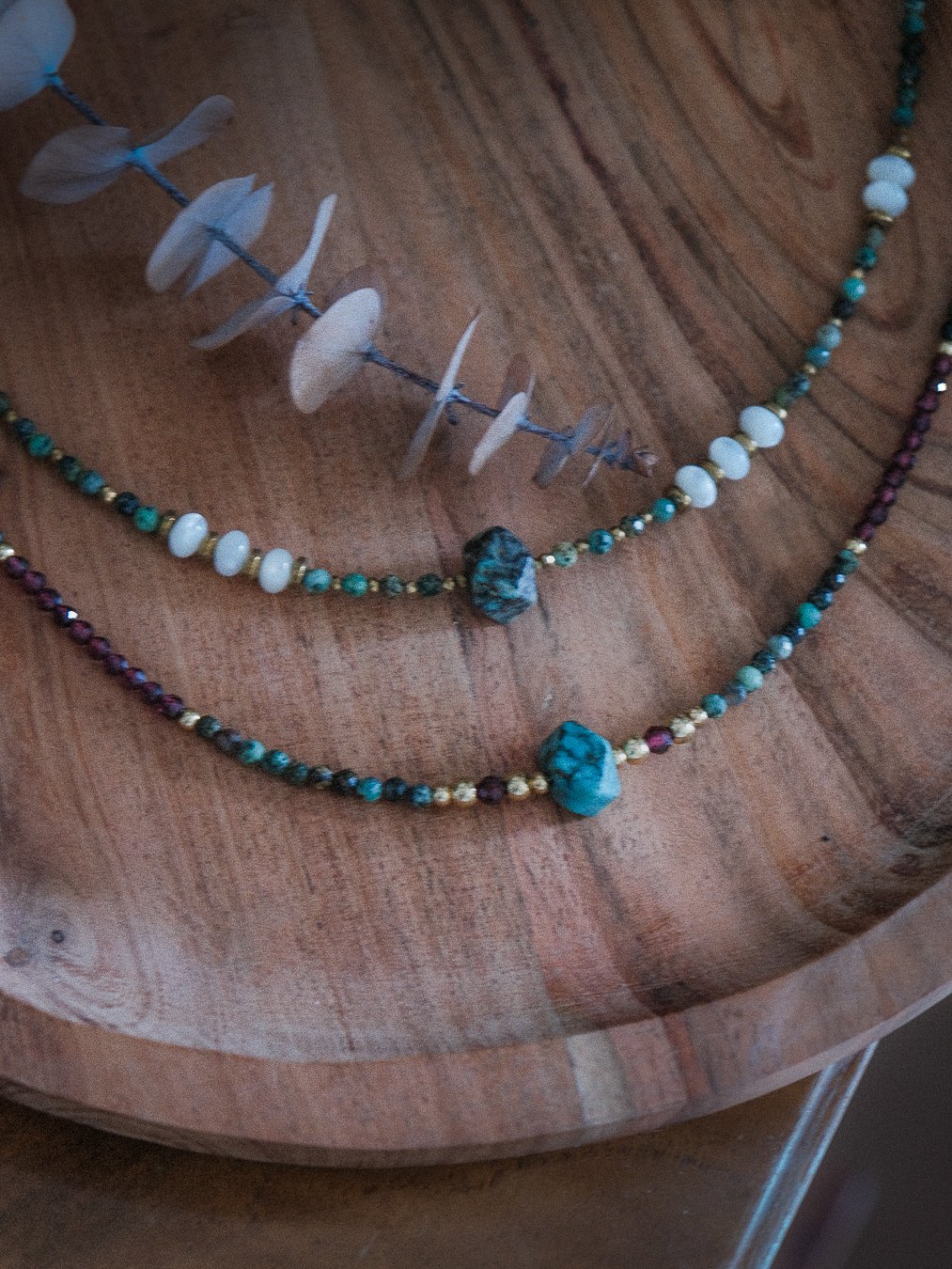 Découvrez nos colliers uniques en turquoise africaine, une pierre naturelle aux nuances vert/bleu-marron profondes, prisée pour sa beauté et ses vertus apaisantes.