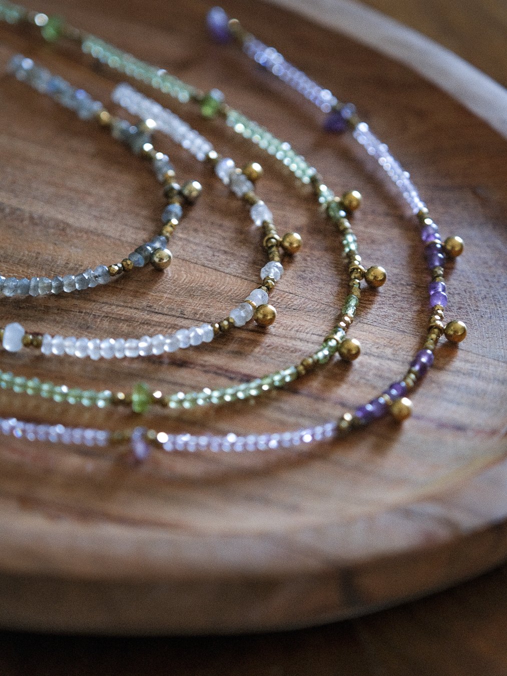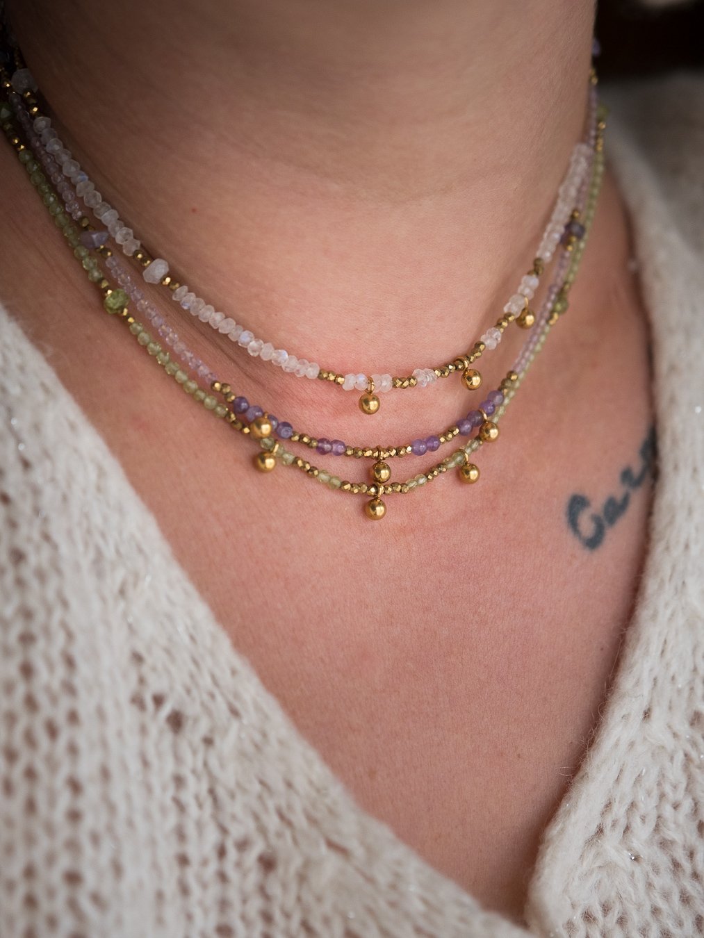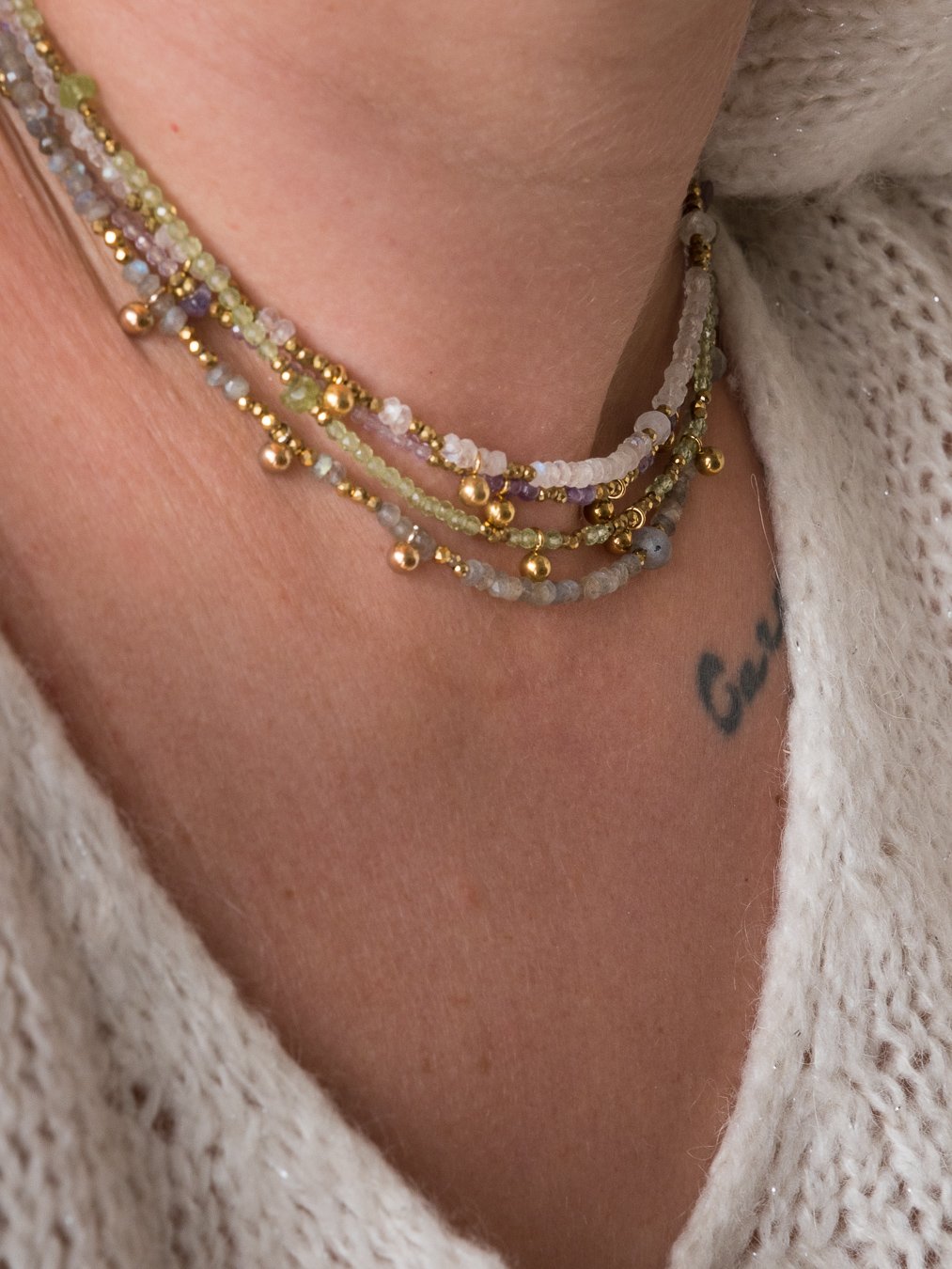 Le collier LIORA est un collier en pierres naturelles fines (Améthyste, Péridot, Pierre de Lune, Labradorite) orné de breloques boule. Un accessoire unique au style boho chic et ethnique, parfait pour sublimer toutes vos tenues.